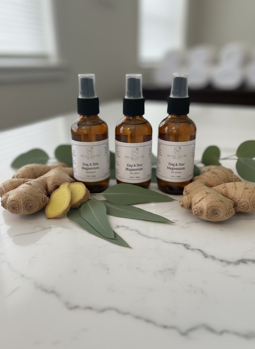 Ignite your senses with our Zing & Zest Magnesium Spray! This invigorating blend features the warming properties of ginger essential oil and the refreshing aroma of eucalyptus essential oil, combined with magnesium chloride to provide relief and rejuvenation.
